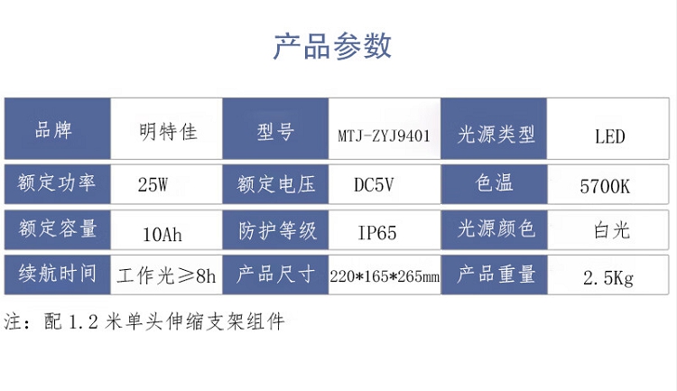 商品名称:【精选】明特佳 MTJ-ZYJ9401 25W、IP65、续航时间≥8h、DC5V、5700K、LED手提式工作灯(含1.2m单头伸缩支架组件)(计价单位:套) 黄色
