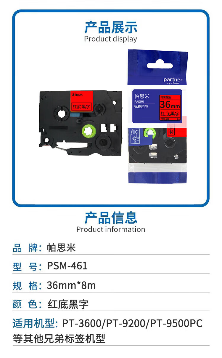 商品名称:【精选】帕思米 PSM-461适用兄弟标签机色带标签纸 规格36mm*8m红底黑字
