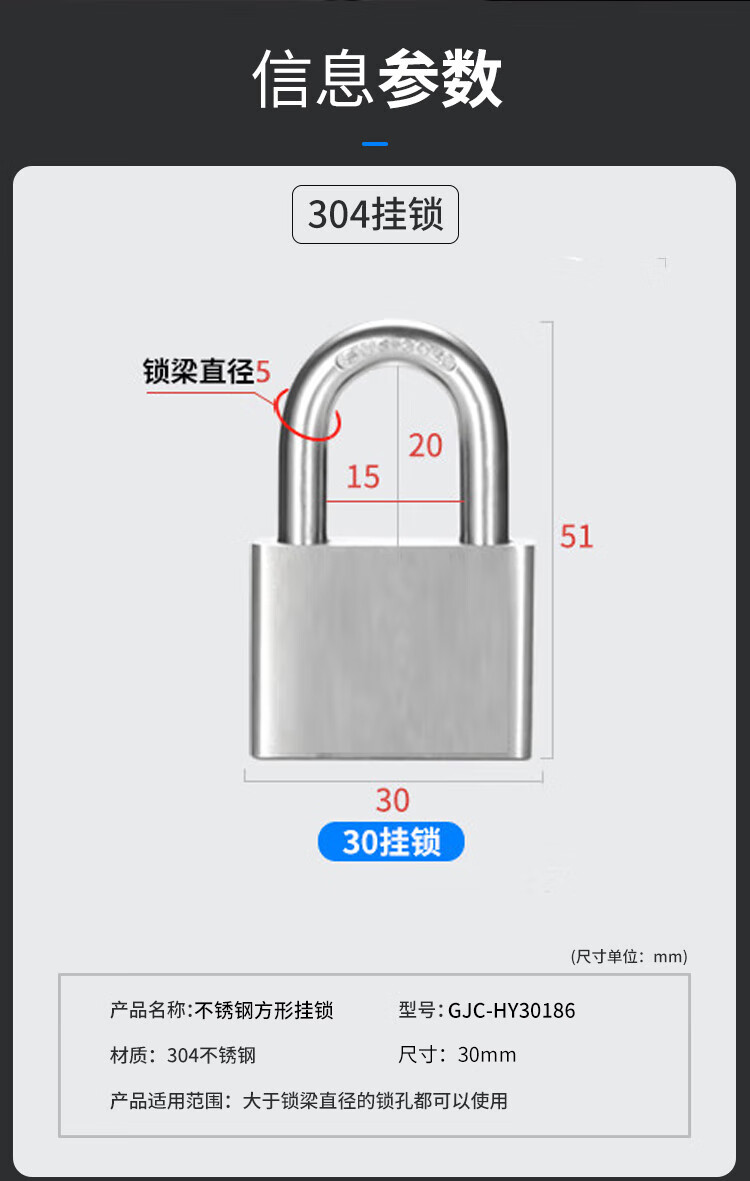商品名称:【精选】华翼 GJC-HY30186 不锈钢方形挂锁30mm 单位:个