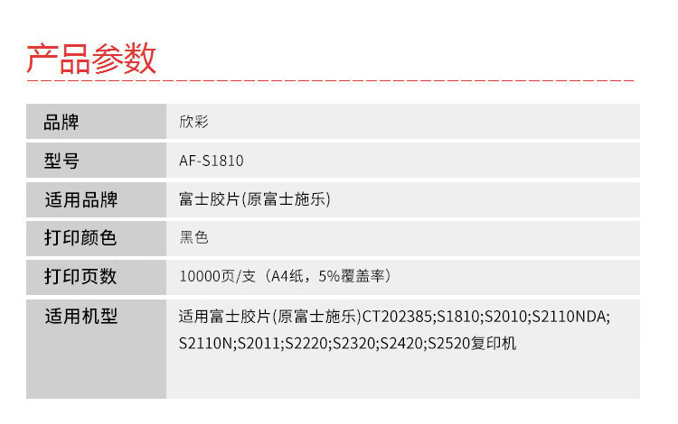 商品名称:【精选】欣彩AF-S1810粉盒 高容 适用富士施乐CT202385 S1810 S2010 S2110NDA S2110N S2011 S2220 S2320复印机