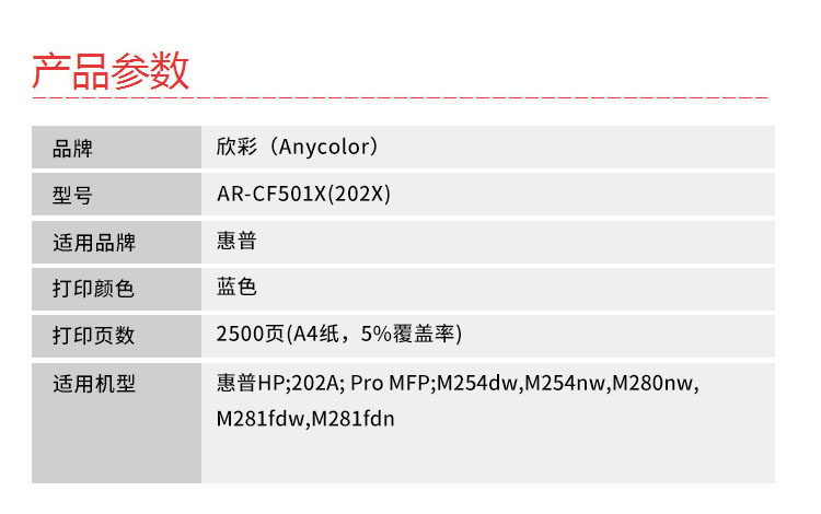 商品名称:【精选】欣彩AR-CF501X(202X)硒鼓蓝色大容量专业版 适用惠普CF501A/X M254dn M280nw M281fdn 单位:支 起订量1支