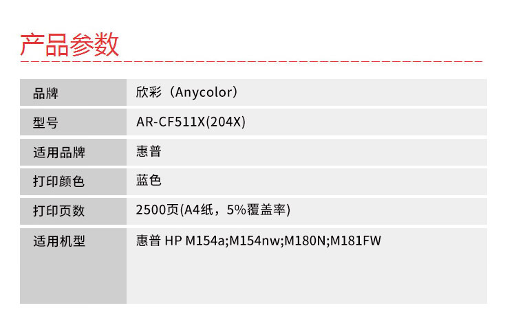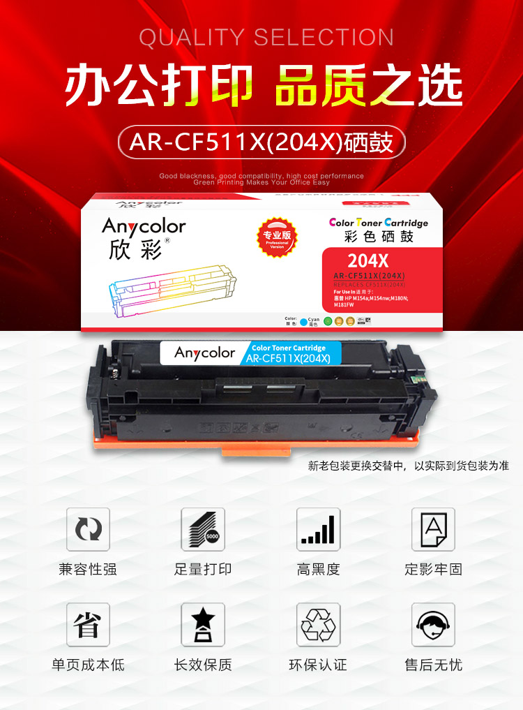 商品名称:【精选】欣彩AR-CF511X(204X)硒鼓蓝色大容量2.5K专业版 适用惠普CF511A/X M154a M154nw M180n 单位:支 起订量1支