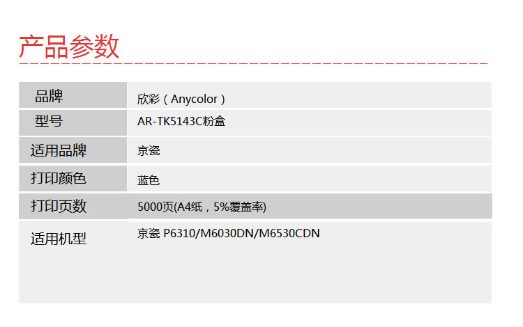 商品名称:【精选】欣彩(Anycolor)TK-5143C墨粉 专业版 AR-TK5143C蓝色 适用京瓷KYOCERA P6310 M6030DN M6530CDN墨粉盒