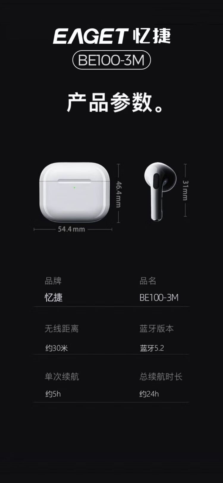 商品名称:【精选】忆捷(EAGET) BE100-3M蓝牙无线耳机 超长续航 HIFI音质 便携式迷你蓝牙耳机敲击触控