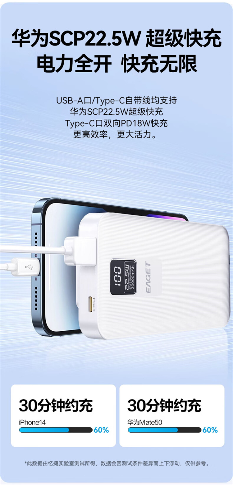 商品名称:【精选】忆捷(EAGET)移动电源EQ202 22.5W自带双线智能数显20000毫安快充多接口便携式 黑色
