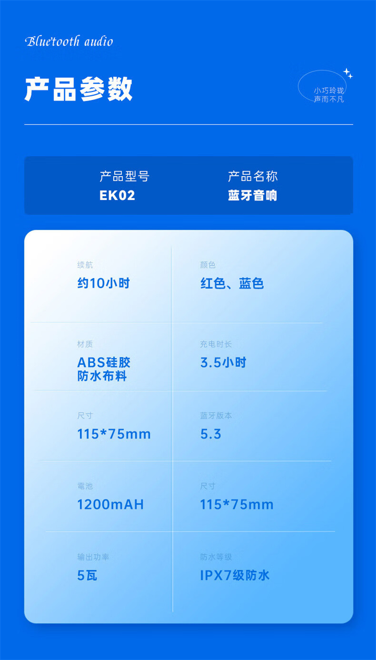 商品名称:【精选】忆捷(EAGET)EK02蓝牙音箱 1200mAH持久续航立体环绕低音音效 蓝牙V5.3播放小巧便携 蓝色