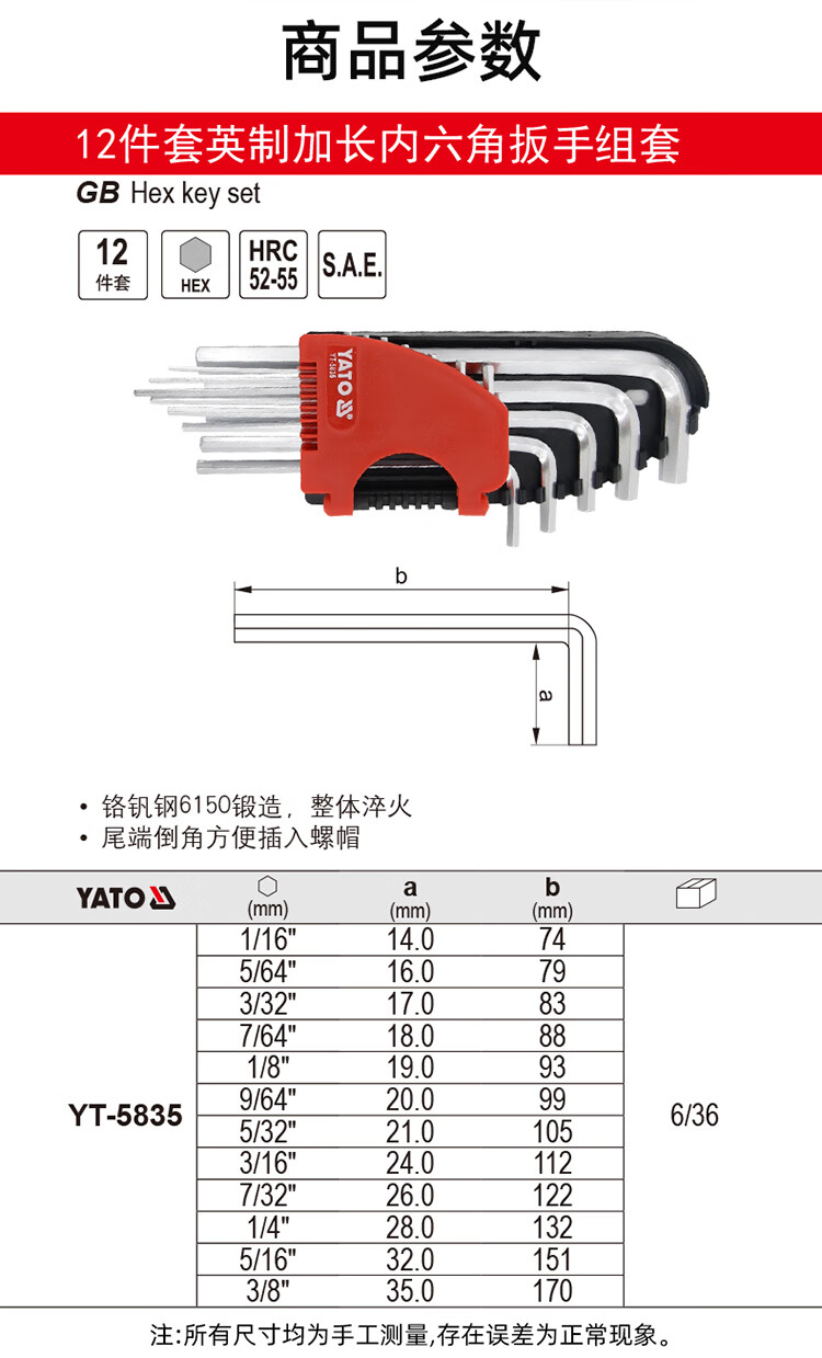 商品名称:【精选】易尔拓 英制特长球头内六角扳手组套12件套YT-5838