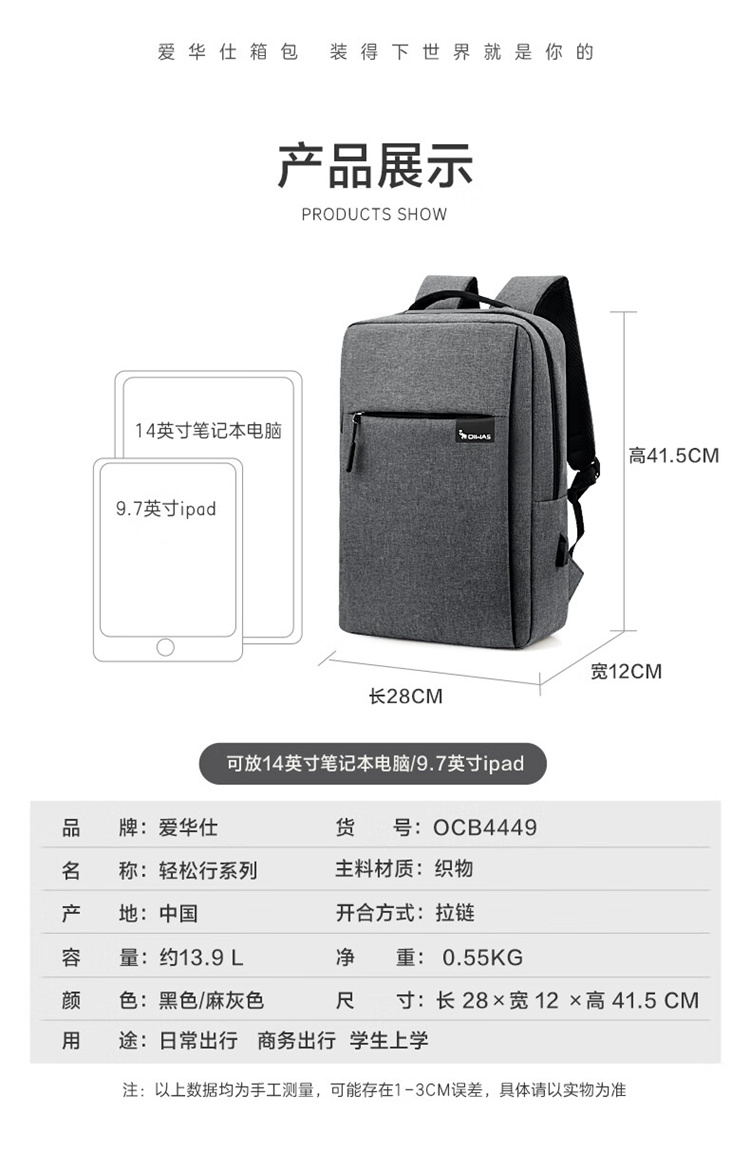 【精选】爱华仕(OIWAS)商务通勤15.6英寸双肩包 耐磨防泼 外置USB充电口可充电 OCB4915 黑色:颜色分类:黑色