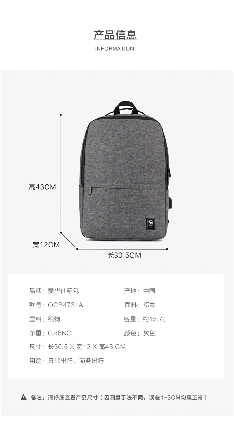 【精选】爱华仕(OIWAS) 双肩包男士商务电脑背包 15寸笔记本包大容量学生书包旅行包OCB4696G黑色:颜色分类:黑色