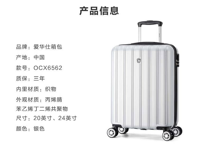 商品名称:【精选】爱华仕(OIWAS)时尚商务伴侣万向轮拉杆箱OCX6562-20银色:颜色分类:银色
