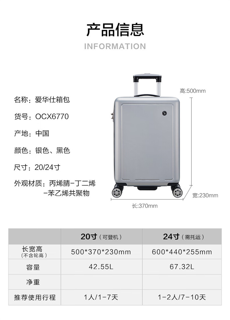 商品名称:【精选】爱华仕(OIWAS)时尚商务伴侣万向轮拉杆箱OCX6562-24银色:颜色分类:银色