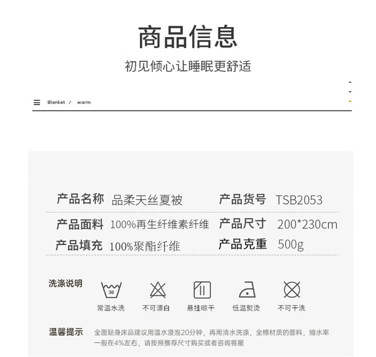 商品名称:【精选】恒源祥TSB2053品柔天丝夏被200*230cm单位:条