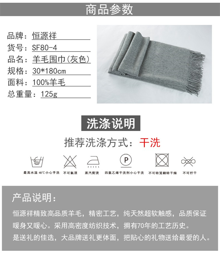 商品名称:【精选】恒源祥礼业SF80-4羊毛围巾灰色 浅灰色 30*180单位:条