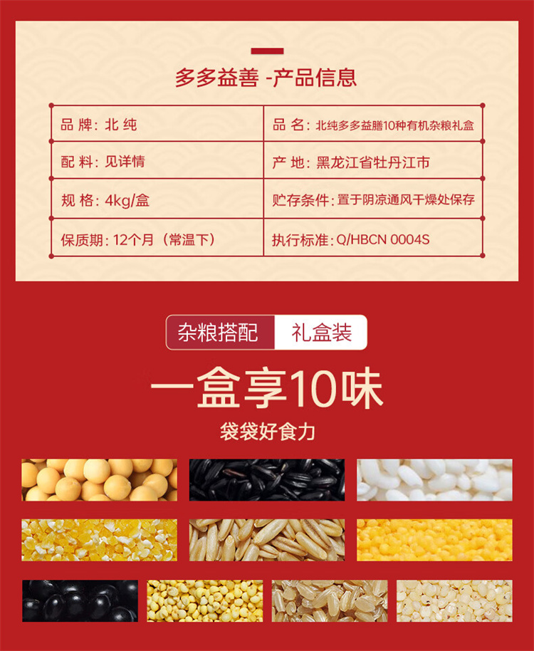 商品名称:【精选】北纯 多多益膳礼盒(10种有机杂粮)4kg