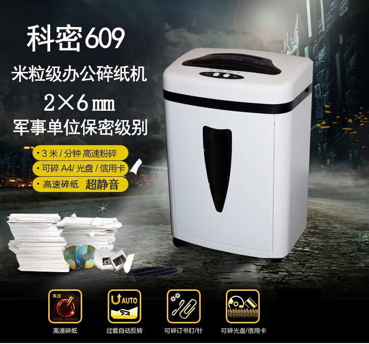 商品名称:【精选】科密 RT-609高保密碎纸机(单次9张 持续40分钟 20L 可碎纸、卡、光盘、回形针、订书针)