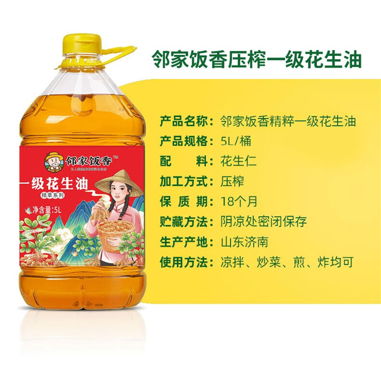 商品名称:【精选】邻家饭香 压榨一级花生油 国家地理标志农产品兰考花生压榨 5L/瓶 LJFX286