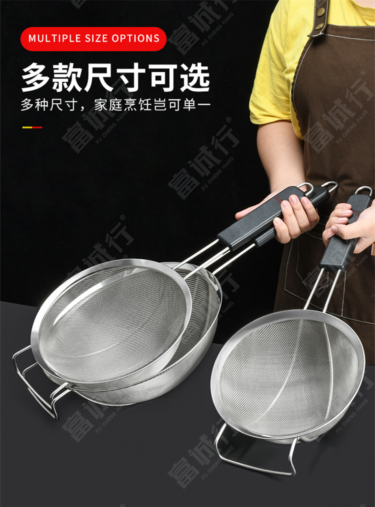 商品名称:【精选】富诚行 不锈钢黑柄加厚过滤网筛 油炸网 家用面粉药渣油格 泡沫捞勺火锅漏勺 22cm