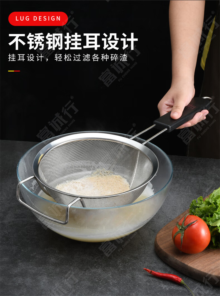 商品名称:【精选】富诚行 不锈钢黑柄加厚过滤网筛 油炸网 家用面粉药渣油格 泡沫捞勺火锅漏勺 28cm