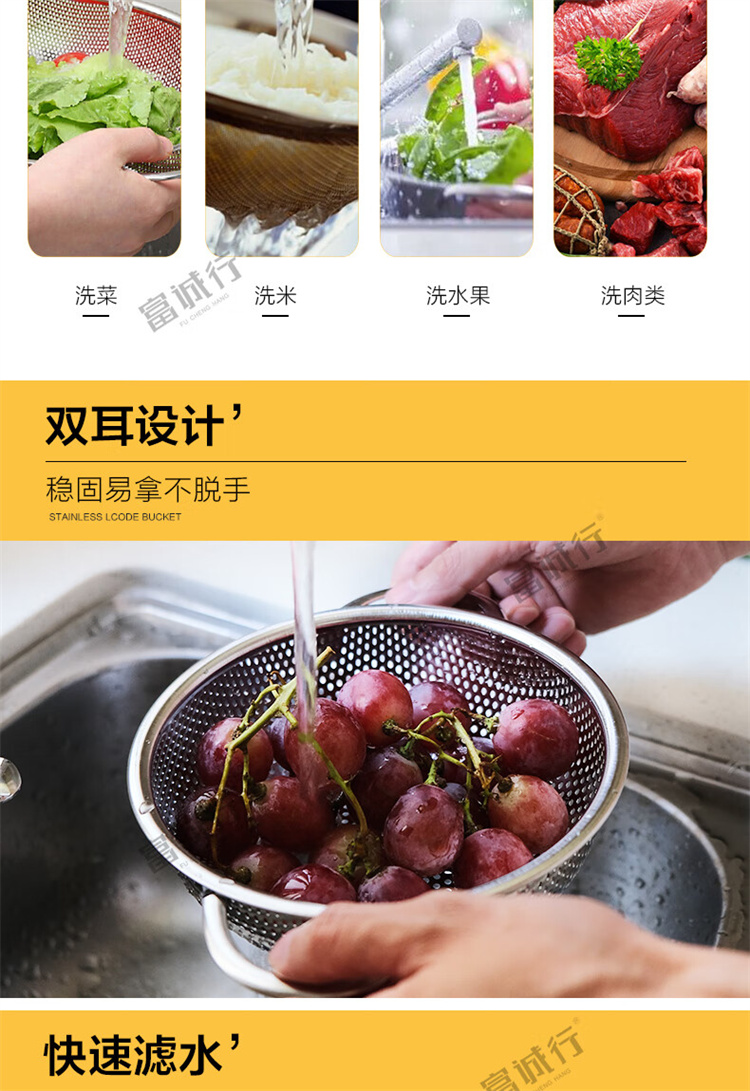 商品名称:【精选】富诚行 不锈钢加厚沥水盆 漏盆 密孔多用篮 加厚款双耳篮 19.5cm