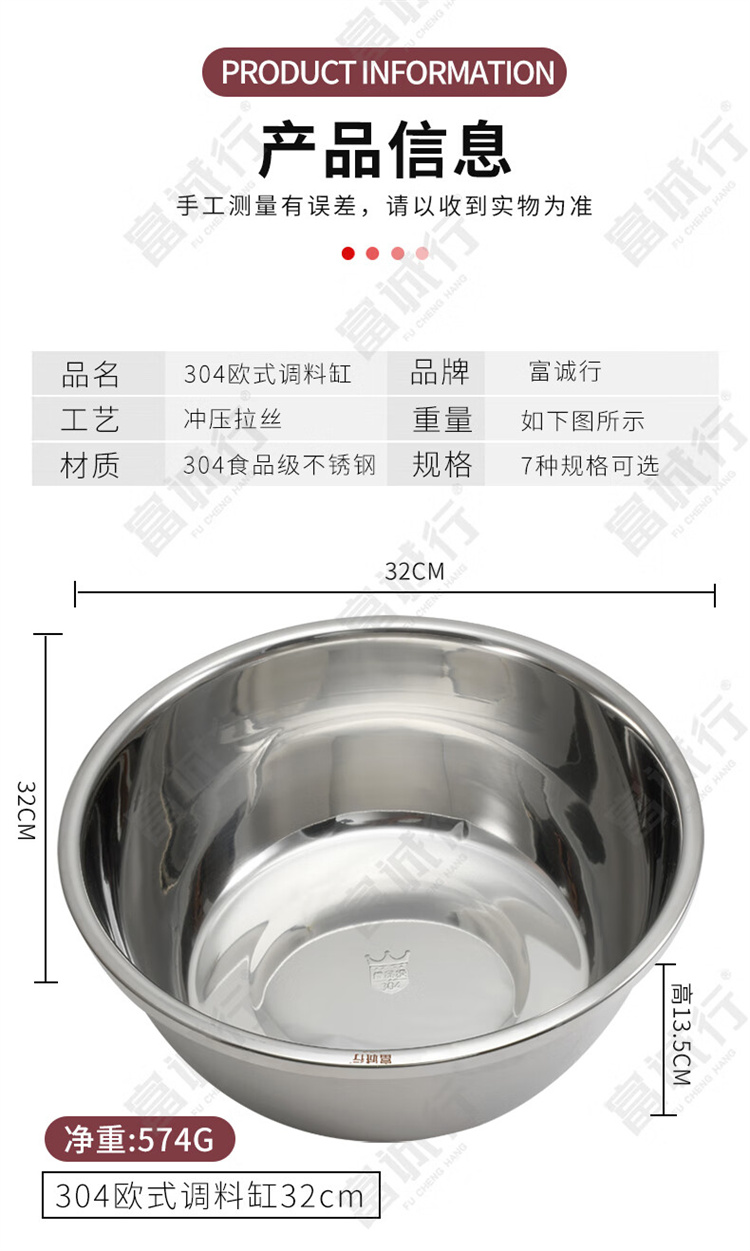 商品名称:【精选】富诚行 FCH-TLG-28 304不锈钢欧式不锈钢盆加厚面盆汤盆打蛋盆调料缸 28cm
