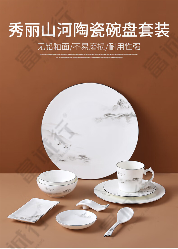商品名称:【精选】富诚行 陶瓷碗盘套装 餐具套装 陶瓷餐具 碗碟套装 秀丽山河系列 摆台十件套