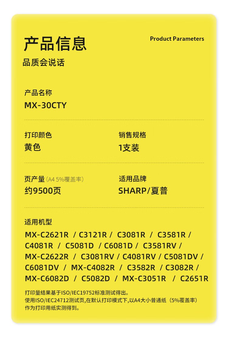 商品名称:【精选】科思特(KST) MX-30CT-YA 打印页数9500页 适用夏普MX-C2621R/C3121R 粉盒 黄色 (计价单位:个)