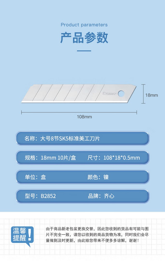商品名称:【精选】齐心 B2852 美工刀片 18mm 10片/盒 (计价单位:盒) 镍色