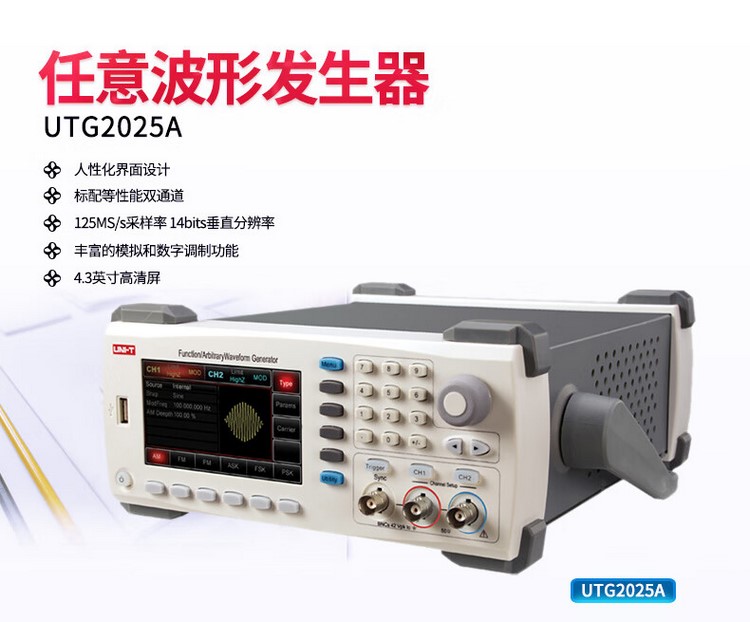 商品名称:【精选】优利德(UNI-T) UTG2025A 25MHz的正弦波输出 函数/任意 波形发生器 (计价单位:台) 标配等性能双通道 8k点任意波存储器 丰富的调制 4.3寸高分辨率TFT彩色液晶显示