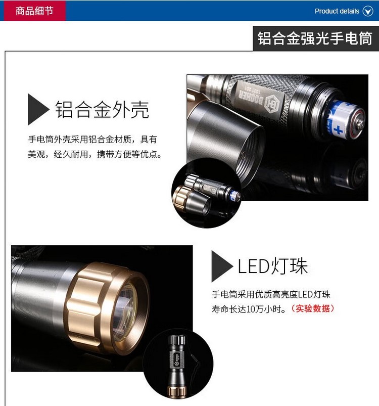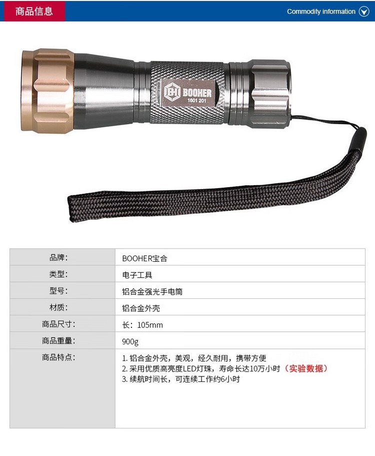 商品名称:【精选】宝合BOOHER(GBHX) 1601201 铝合金强光手电筒1节5#电池